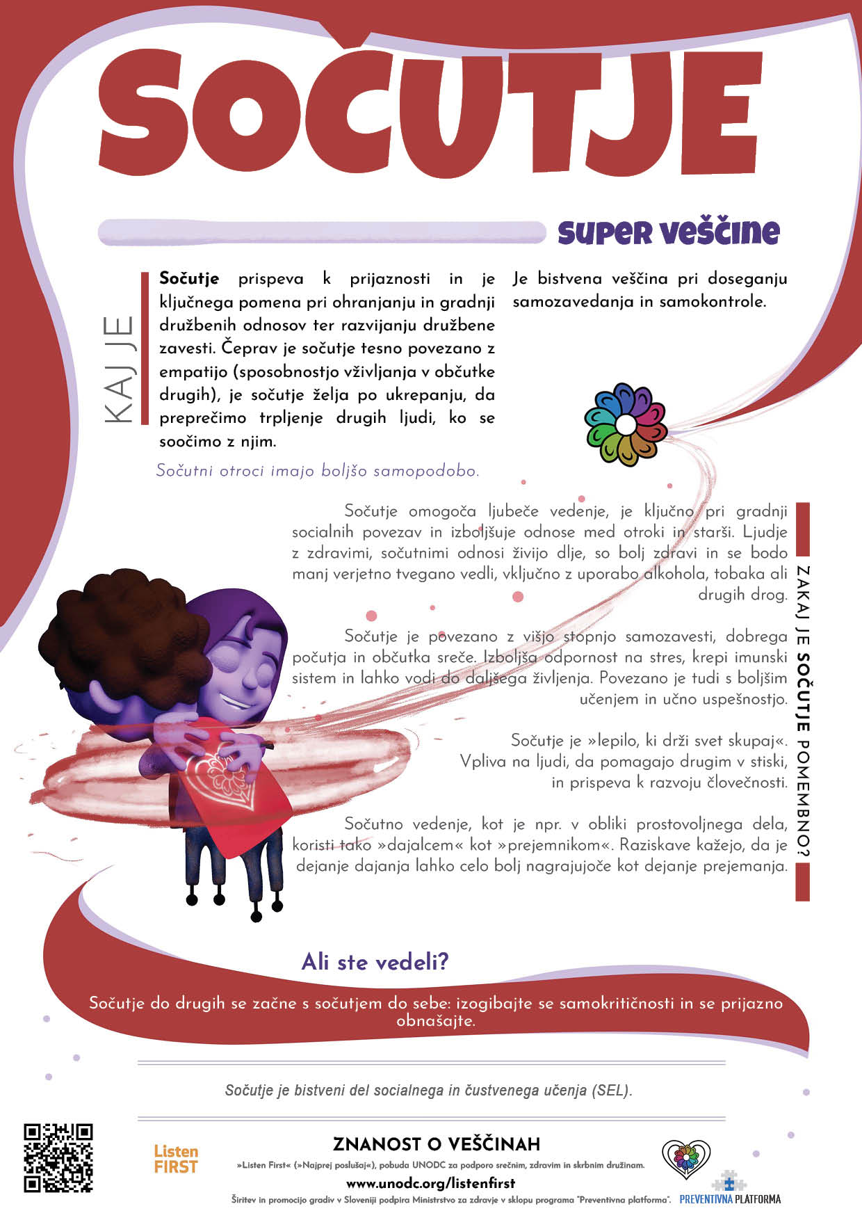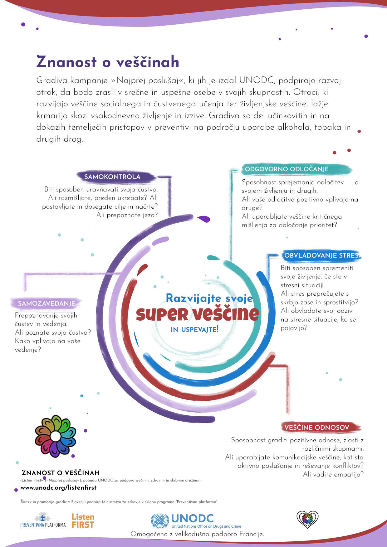 Borovnica, 26. junija 2022 – V sklopu obeleževanja svetovnega dne na področju drog (“World Drug Day”) začenjamo z drugim delom preventivne kampanje na področju socialnega in čustvenega učenja »Znanost o veščinah« (v originalu »The Science of Skills«) v sklopu širše preventivne kampanje »Najprej poslušaj« (»Listen First«). Kampanjo izvajamo v sodelovanju z Uradom OZN za droge in kriminal (UNODC), s katerimi smo pripravili vrsto novih uporabnih gradiv (npr. letakov, naknadno pa bomo pripravili tudi nekaj video vsebin) z nasveti za starše in skrbnike, zlasti z vidika ključnih (otrokovih) veščin na področju socialnega in čustvenega učenja.